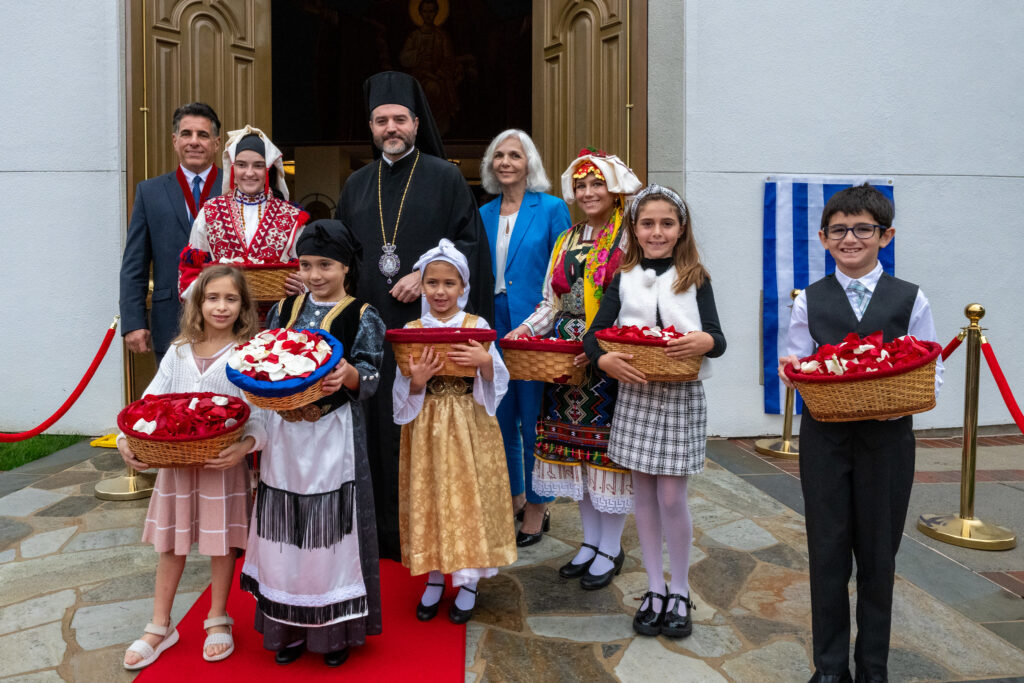 Welcoming His All-Holiness to the parish were children dressed in traditional Greek clothing, who held flowers and waved flags of the Ecumenical Patriarchate as the Ecumenical Patriarch arrived. This was the Ecumenical Patriarch’s first visit to Saint Katherine Church.