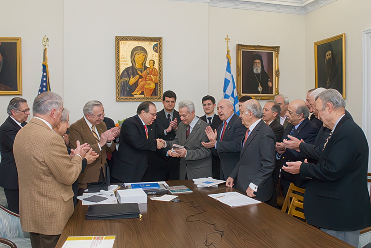 Members of the National Council presented Vellios with a plaque at the Greek Orthodox Archdiocese on December 12, 2008. The plaque acknowledged his efforts and accomplishments in promoting religious freedom for the Ecumenical Patriarchate, stating: